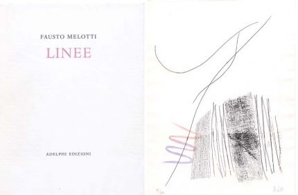 Volume in 4°cm. 32 X 24 pag.80 numerose immagini a piena pagina,astuccio,stampato su carta pesante Magnani di Pescia contenente UNA delle nove acqueforti della serie Linee. Stamperia Valdonega di Verona. Cat. Skira "Fausto Melotti" Segno, musica e poesia
