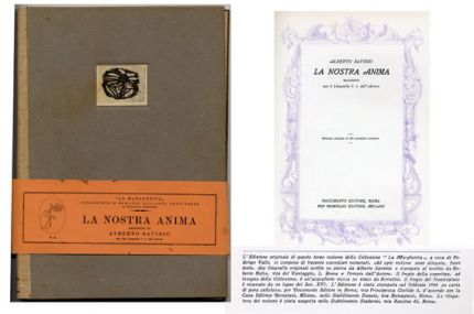 Colophon:L'Edizione originale di questo terzo volume della Collezione “ La. Margherita “ a cura di Federigo Valli, si compone di trecento esemplari numerati. Ad ogni volume sono allegate, fuori testo, due litografie originali scritte su pietra da Alberto Savinio e stampate al torchio da Roberto Bulla, via del Vantaggio, 2, Roma e firmate dall'Autore. Il fregio della copertina, ad insegna della Collezione, è un'acquaforte incisa su zinco da Bartolini II fregio del frontespizio è ricavato da un legno del Sec. XVI. L'Edizione è stata stampata nel febbraio 1944 su carta di pura cellulosa, per Documento Editore in Roma, vìa Principessa Clotilde 5, d'accordo con la Casa Editrice Bompiani, Milano, nello Stabilimento Danesi, via Romagnosi, Roma. La rilegatura dei volumi è stata eseguita nello Stabilimento Staderini, vìa Baccina 45, Roma.